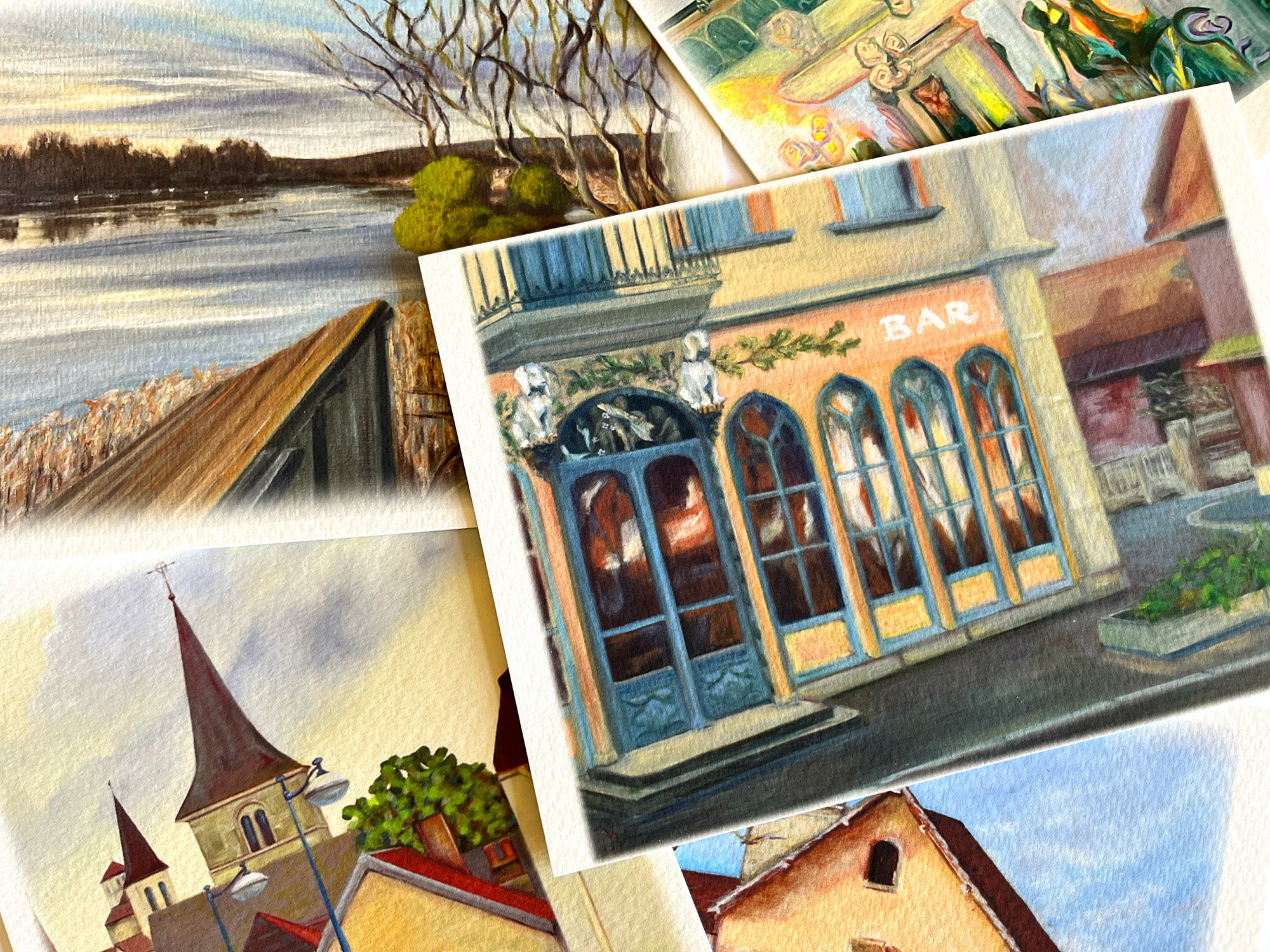 Peinture originale La Médiathèque de Laignes "Le Café des Chiens Blancs"